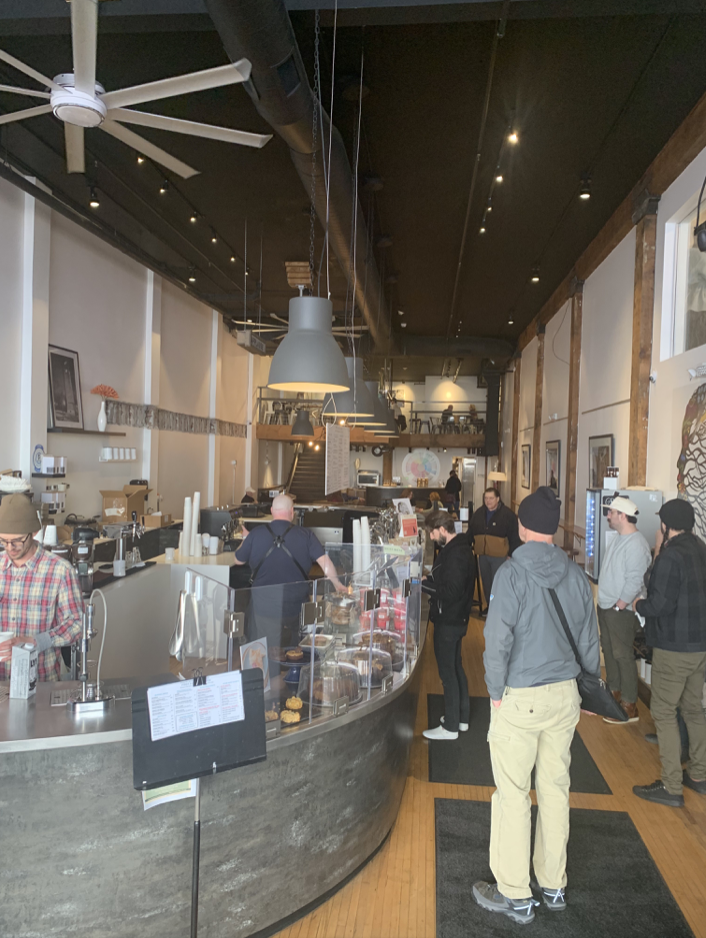 Upon opening the door, I was overtaken by an aroma that was both comforting and curious, both warm and vibrant. As I stepped inside the visuals of the interior space were much the same, welcoming me in while beckoning me to explore. A seating space with comfortable lounge chairs and an overhead mobil of brass instruments sits between the entrance and a very spacious barista station. Merch was excellent, both coffee accessories and apparel, and their logo had me buying multiple stickers for myself and friends. The retail space measures about 3,000 sq ft including a mezzanine level and a separate coffee tasting bar where a free, first tasing experience appears to be a constant offering. As you make your way back into the space you come to an enormous, one piece, walnut slab table, and its right about there that the coffee aroma is overtaken by their in-house baked goods made in the back of the store. Food offerings were freshly made and featured excellent sweet, savory and protein options. Wall art featured a local photographer and other adornments include a large rendering of their very cool logo and a huge mobile of brass and percussion instruments hanging from the ceiling. Bathrooms were large, clean, and of first order. This is an interesting and comfortable space, that invites you to explore. In my view, more of a hang out and visit vibe vs hole up and work. Its cool enough to be rentable as an event space, which is one of their offerings.