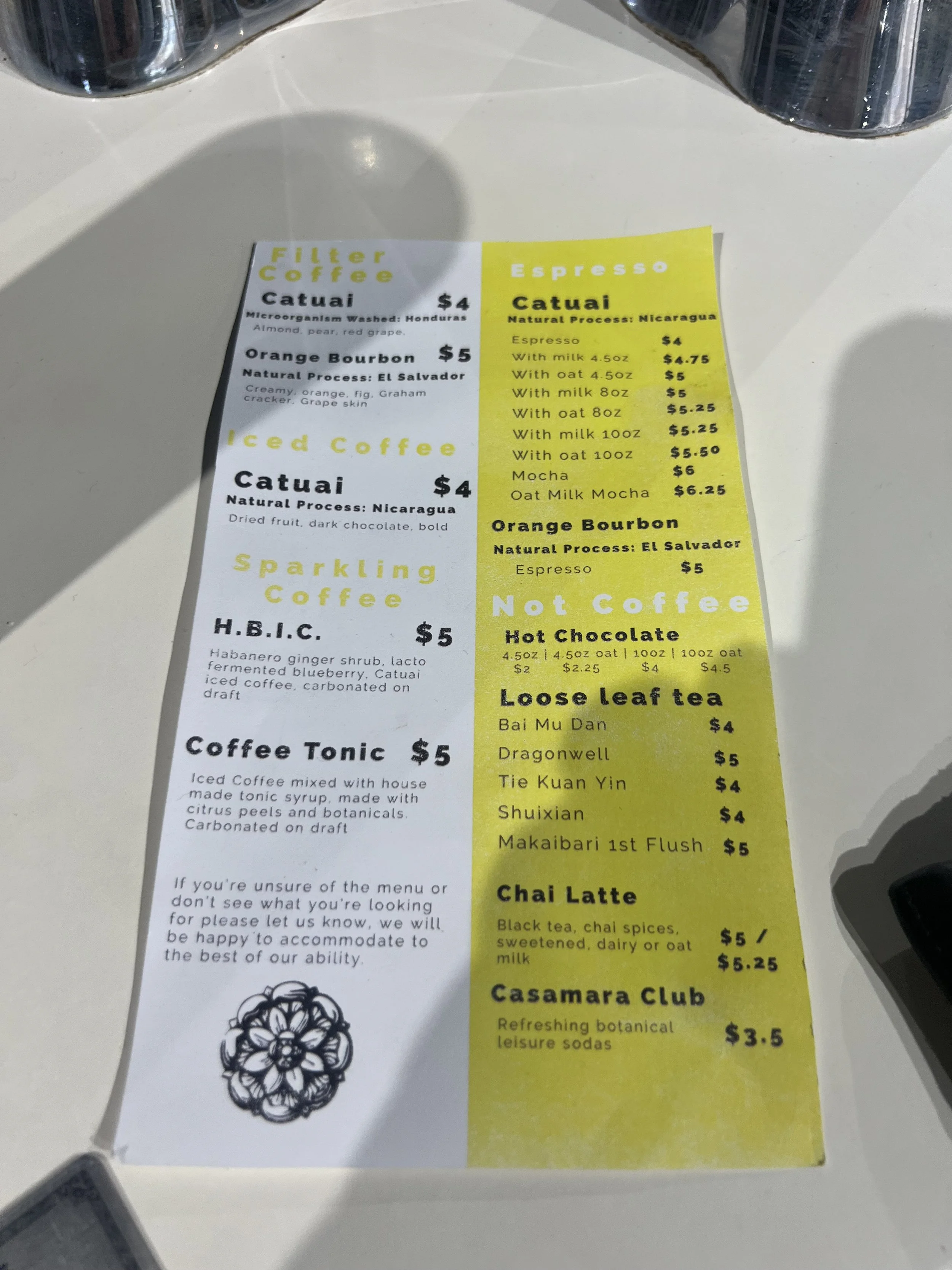 The Orange Bourbon roast coupled with the Catuai espresso was inspiring. The coffee was indeed on the mark as creamy yet with a sweetness of the orange and grapes as advertised. A phenomenal espresso overlay with the coffee brought a smile.