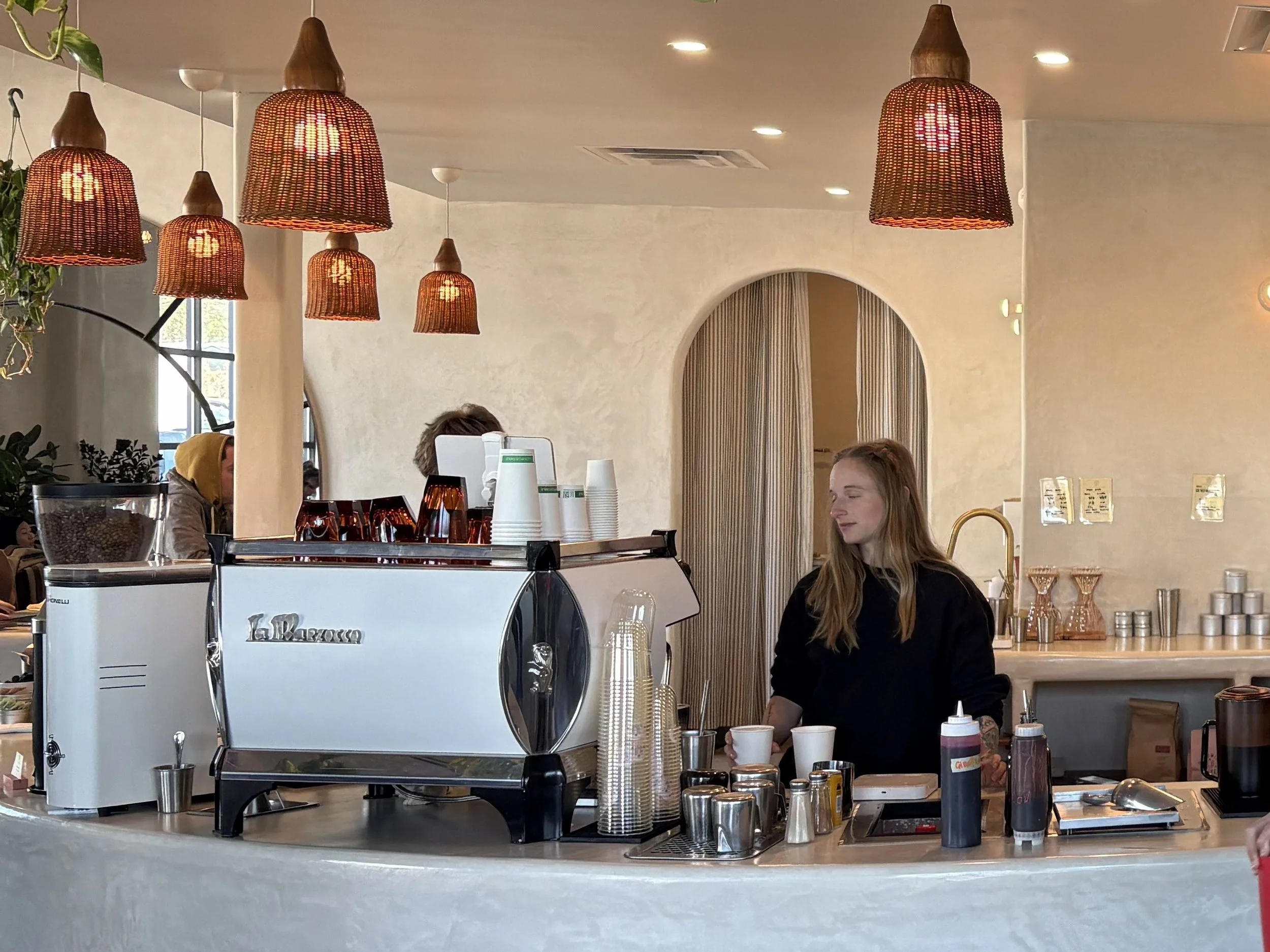 When grinding coffee, the noise tends to reverberate which makes it harder to concentrate or have a conversation. Maybe it was just timing, but it was distracting. Also, during our visit, the back area did not have any music playing, which made the space feel a bit quiet. A little background music could make it feel more welcoming and complete.