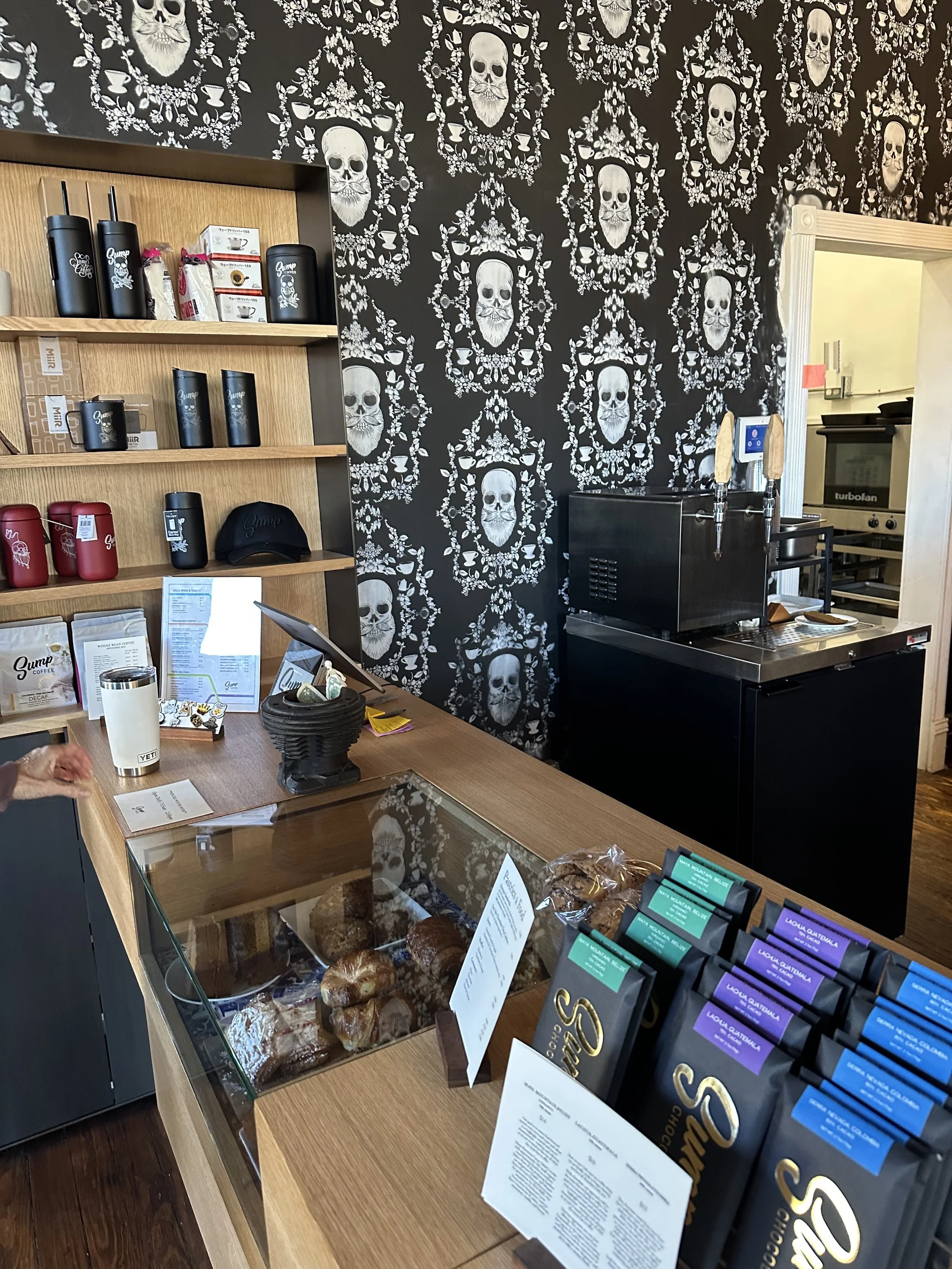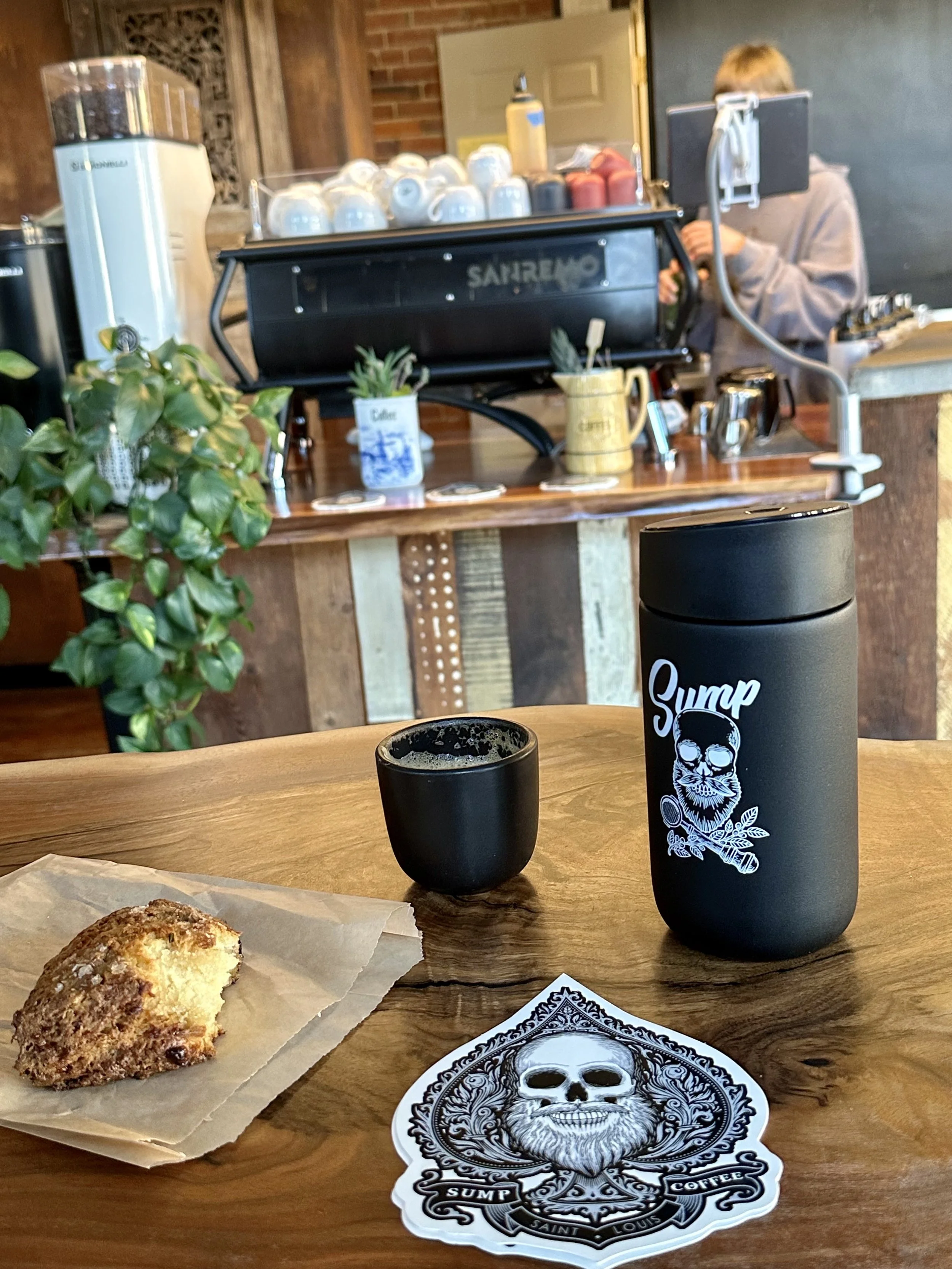 their striking, bearded skull logo, which appears to be a nod to the owner’s facial hair along with a penchant for motorcycle and tattoo culture. Recycled wood and a walnut slab table top with a natural edge bring texture and warmth to the décor. Merchandise is superb, from apparel to coffee kit. They have a small outdoor space in front of their store front facing Jefferson Ave, and have two rooms with bar, counter, and table seating. This would be a great spot to have a small meeting, or even better, to chill out and add a few chapters to your library of coffee knowledge. I enjoyed a delicious apple scone. I appreciate a shop that pays attention to detail, something Sump does in spades (see their free stickers).
