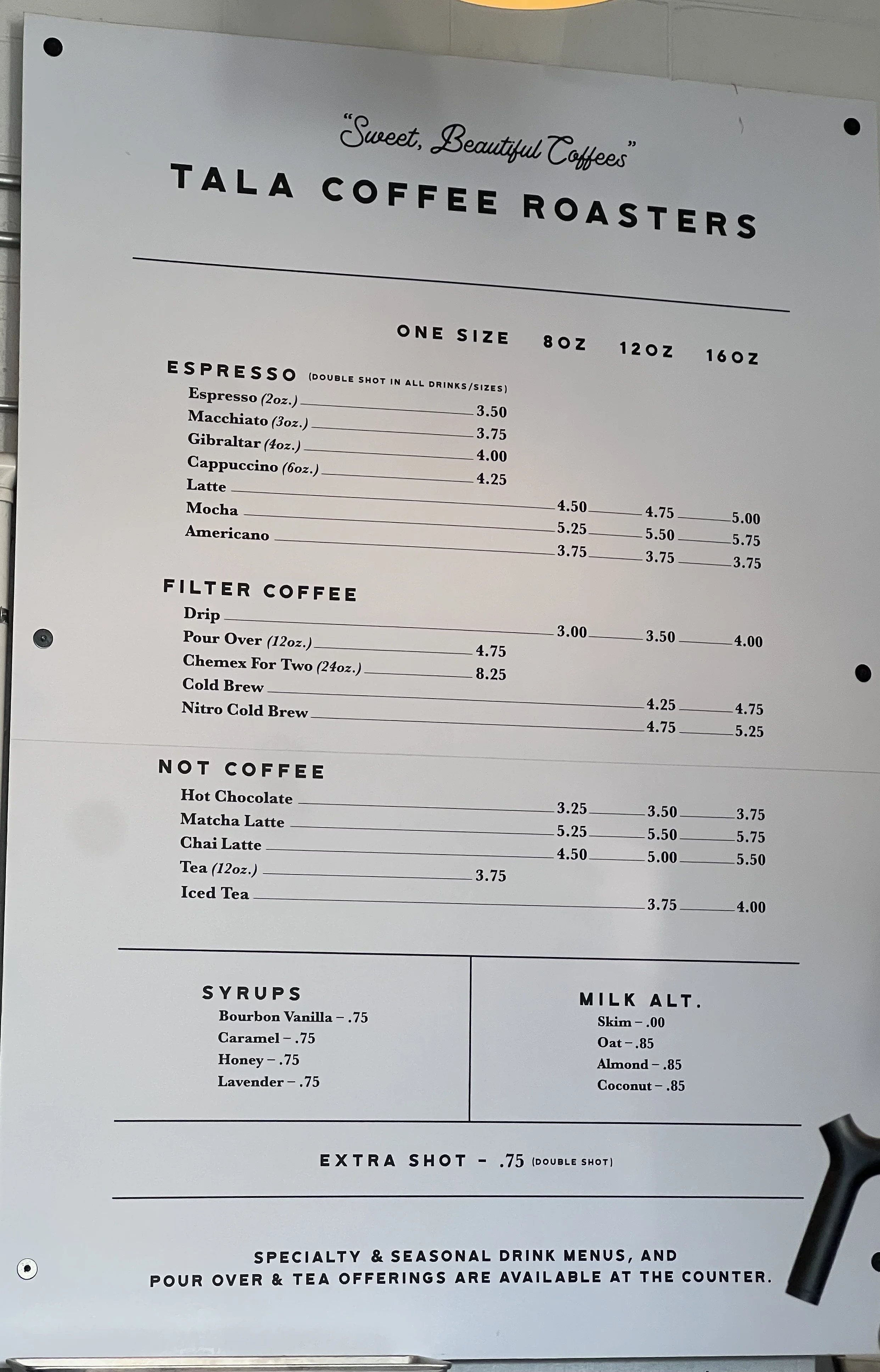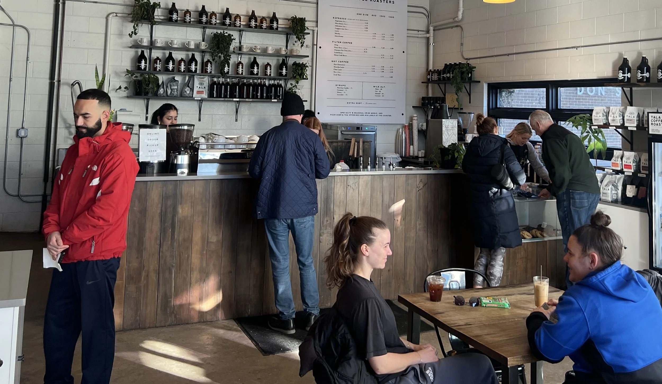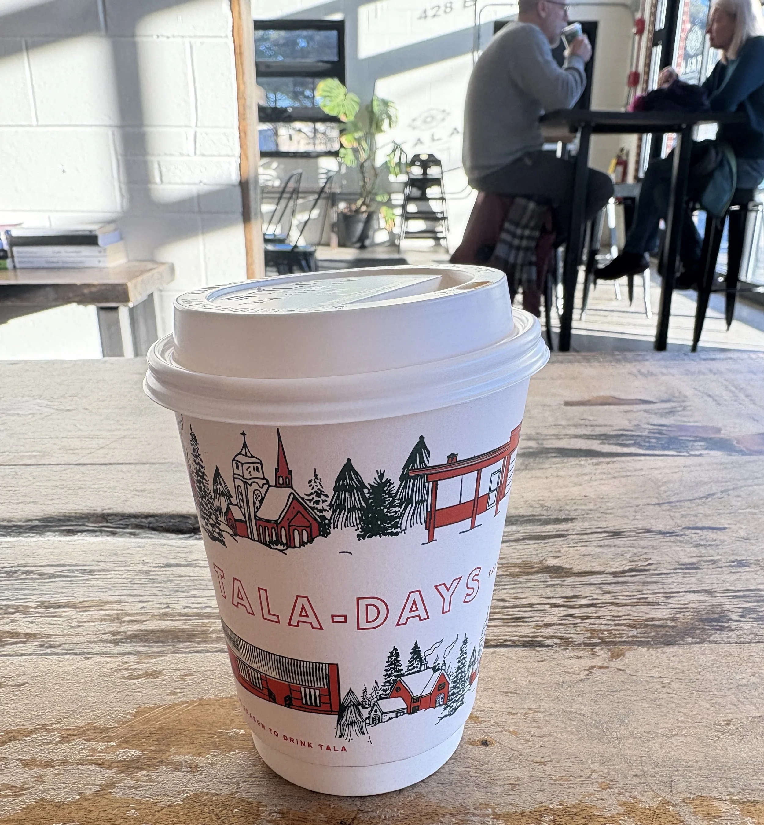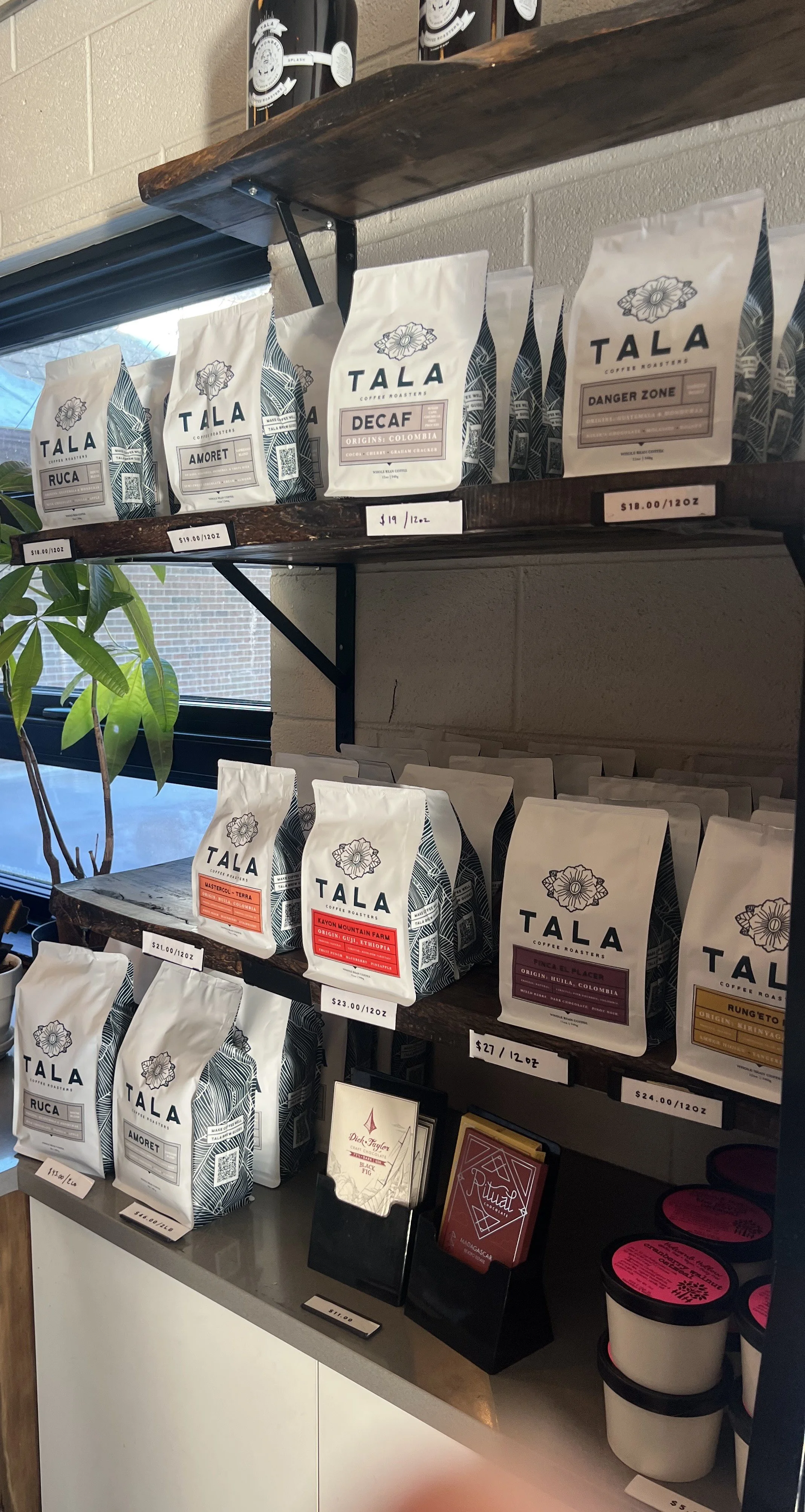 My first entre into the Tala experience was a gift from a friend/client of beans. My fam was “over the moon” with the quality so I have wanted to go to the original shop for quite some time. Since Clyde and our intern were in town last weekend we made the trek to Highwood. The coffee is fantastic; today’s drip was the Ruca which was indeed rich but not dark with a great milk chocolate overtone and slight sweetness of the apple undertone. The combination of the Amoret espresso with its semi- sweet chocolate made for a coffee that you want to linger over….and we did. Clyde’s cortado had great consistency and the side car of seltzer is a welcome addition.