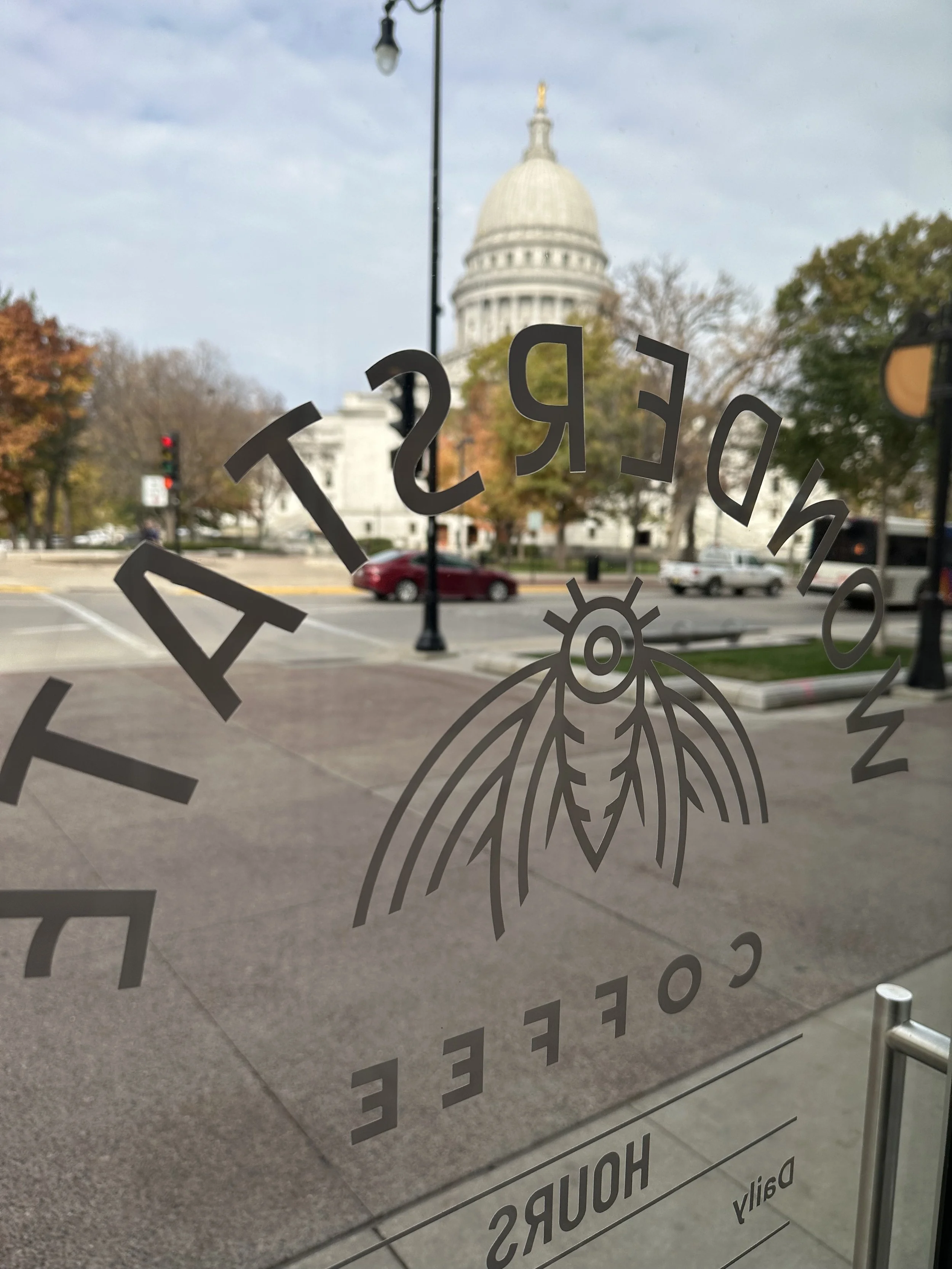 A functional and pleasing blending of Scandinavian style and minimalism with a hint of cubism. The floors are concrete, the ceilings tall with exposed mechanicals all in white. Exterior walls are floor to ceiling glass, taking maximal advantage of the downtown vista prominently featuring the white marbled state Capitol across the street. There is ample seating, both small booths, window stools, and tables, along with strategically placed outlets. Seating is all wood, nothing is cushioned, but its comfortable and inviting nonetheless. Its bright and clean, and a good place to meet up, hang out, or get work done. Merch is top quartile, including biking hats, glassware and mugs, beanies and carafes. Bakery is similarly well done, ranging from their savory honey thyme chèvre or meyer lemon lavendar scones to their ginger cardamon cookie. They also have a cool logo, a modern rendering of a cicadas that is simple yet striking. They also sell various teas, wine, locally brewed beers, and artisan sodas.